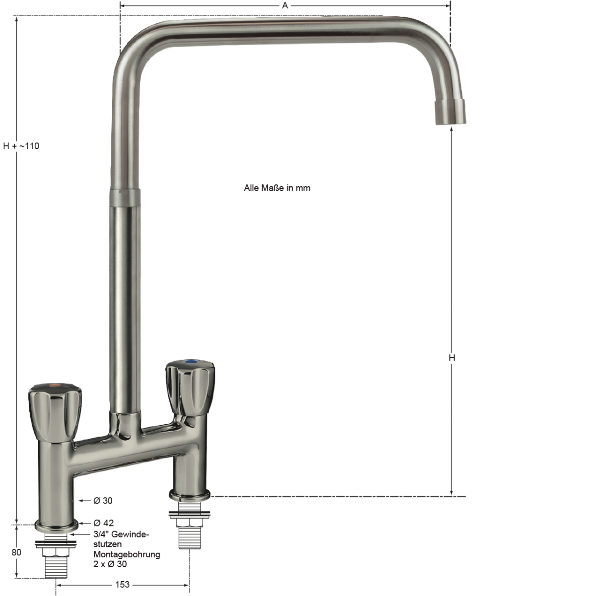 - Montagebohrung: Abstand 153 mm - 2x Ø 30 mm