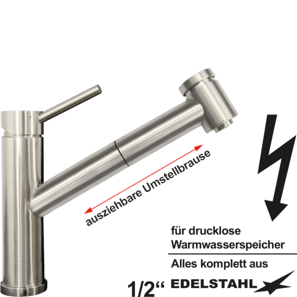 Hebelmischer-Spültischbatterie 1/2″ A200 H140 (auf Sockel 100mm) mit Brause aus Edelstahl aus massiven Edelstahl für drucklose Speicher