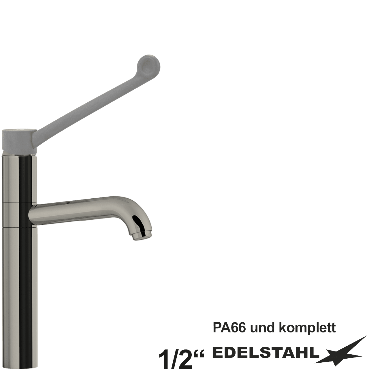 Hebelmischer-Spültischbatterie 1/2″ mit Schwenkauslauf und mittellangem Hebel (auf Sockel 200mm) komplett aus Edelstahl