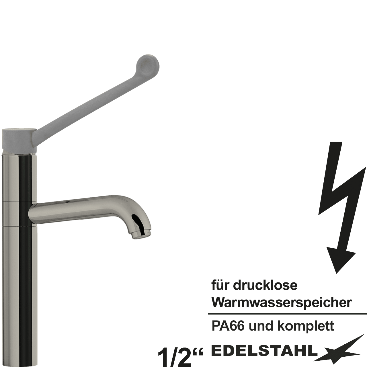 Hebelmischer-Spültischbatterie 1/2″ mit Schwenkauslauf und mittellangem Hebel (auf Sockel 200mm) komplett aus Edelstahl für drucklose Speicher