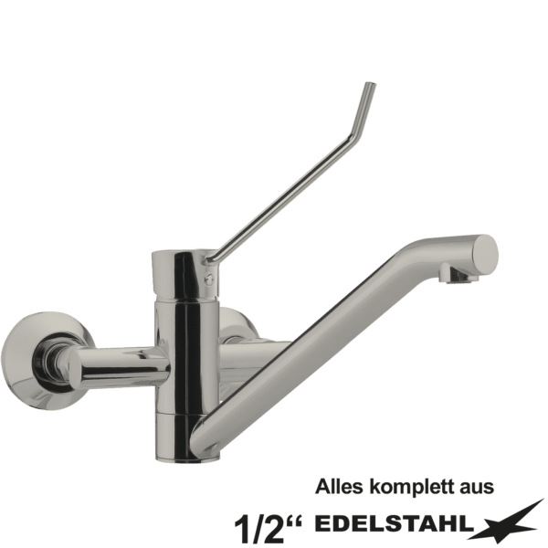 Hebelmischer-Wandbatterie 1/2″ mit massivem Schwenkauslauf und langen Hebel komplett aus Edelstahl