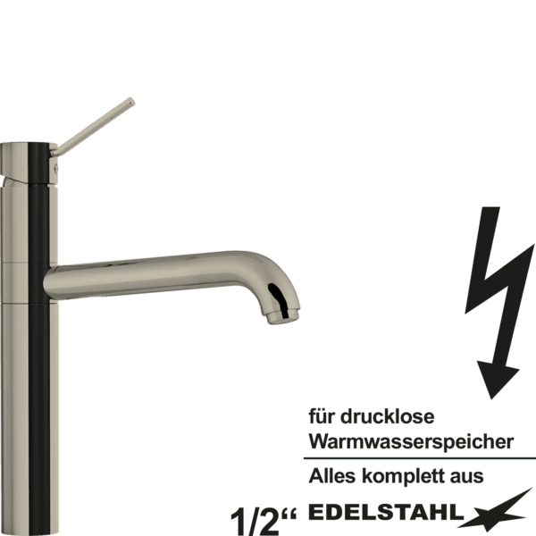 Hebelmischer-Spültischbatterie 1/2″ mit massiven Schwenkauslauf und kurzen Hebel (auf Sockel 200mm) komplett aus Edelstahl für drucklose Speicher