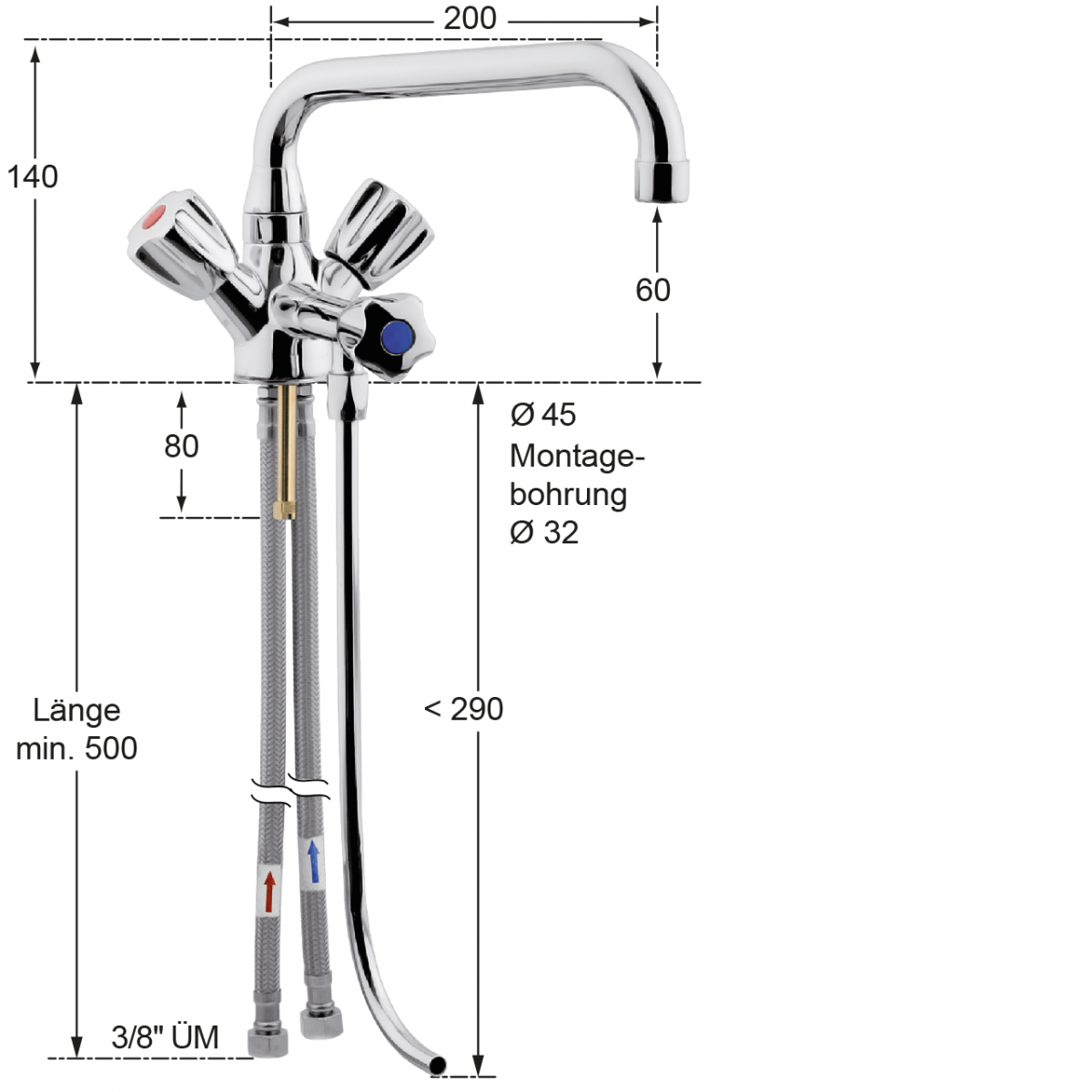 Ventilabgang mit Fettkammeroberteil 3/8″ und Unterspülrohr L < 290 mm für Kaltwasser