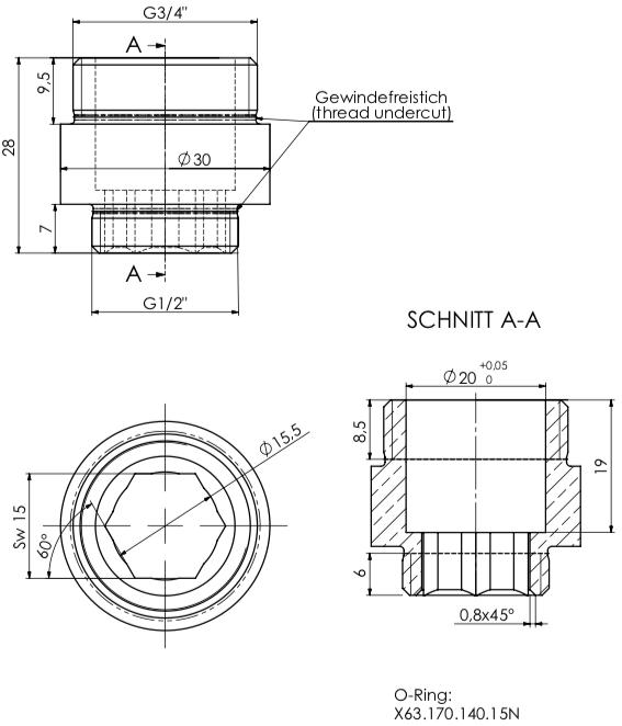 Gewindenippel zu Standfuß gerade für RV 1/2″ AG mit O-Ring x 3/4″ AG Ø20 mm