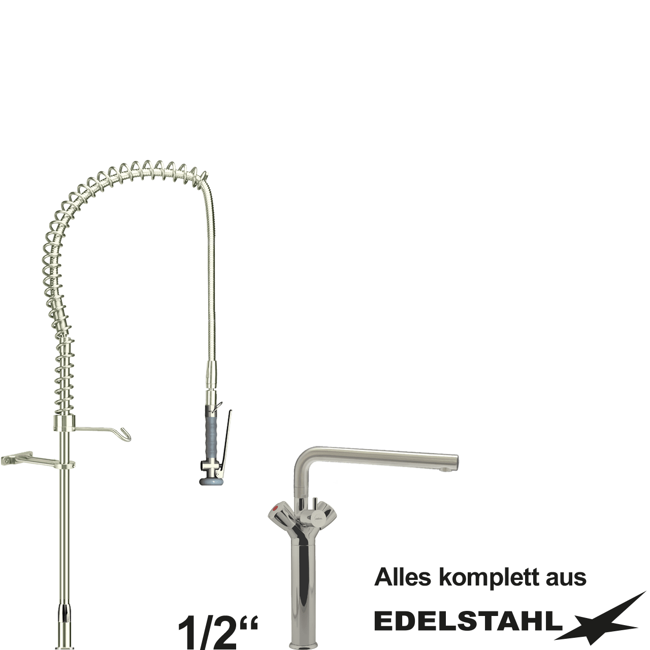 Vorspülbrausen Zweigriffmischer-Einlochbatterie 1/2″ mit Auslaufventil am Rohr mit RV komplett aus Edelstahl