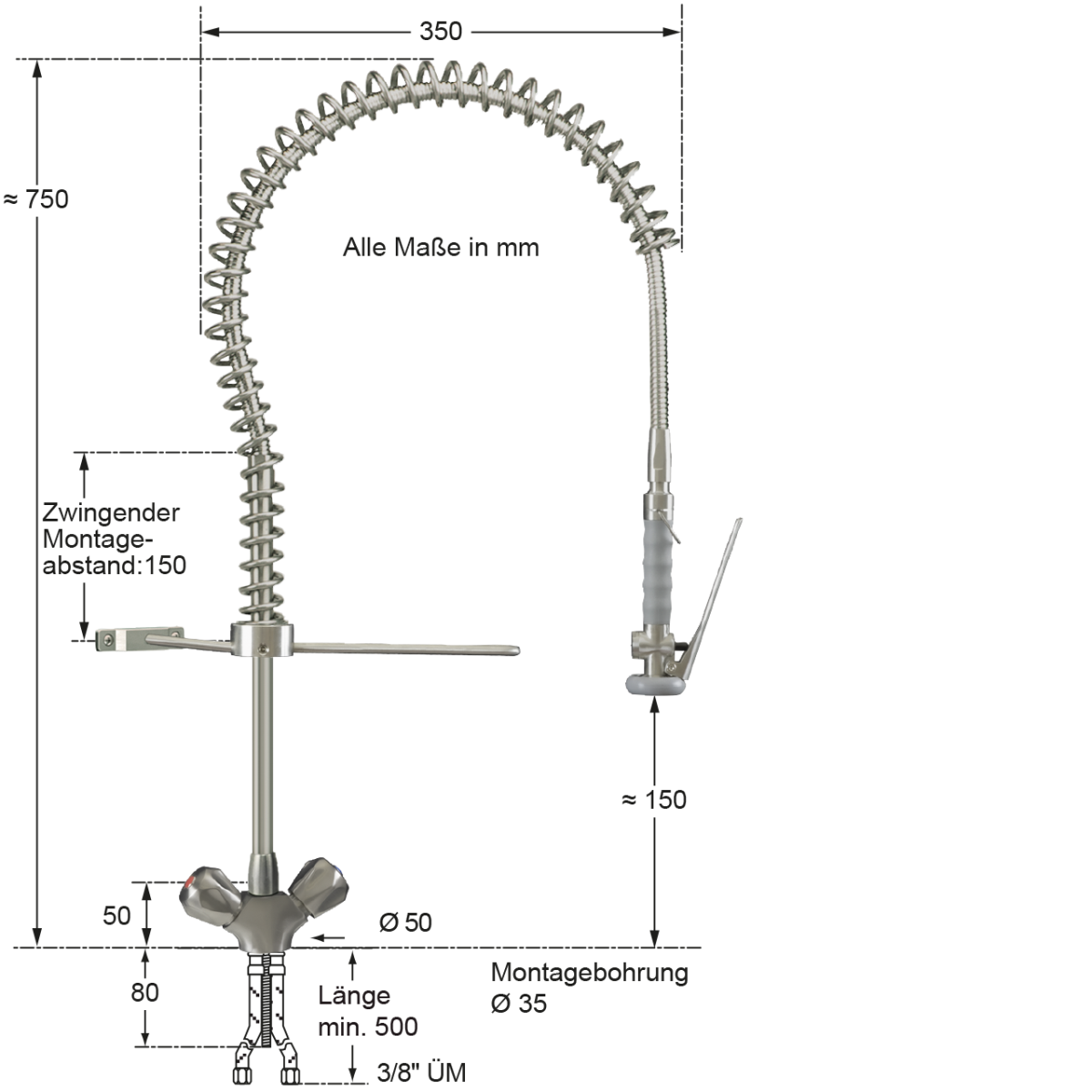 Armaturenkörper, Kronengriffe, Standrohr, Standrohrhalter, Brauseeinhängehaken, Federhalter, Tragfeder, Gelenkadapter und Brause komplett aus poliertem Edelstahl