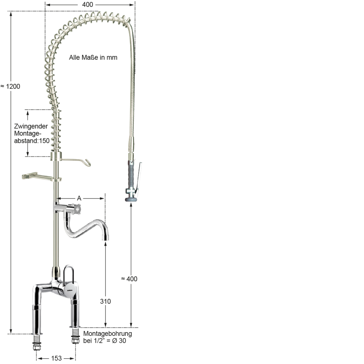 - Montagebohrung: Abstand 153 mm - 2x Ø 30 mm