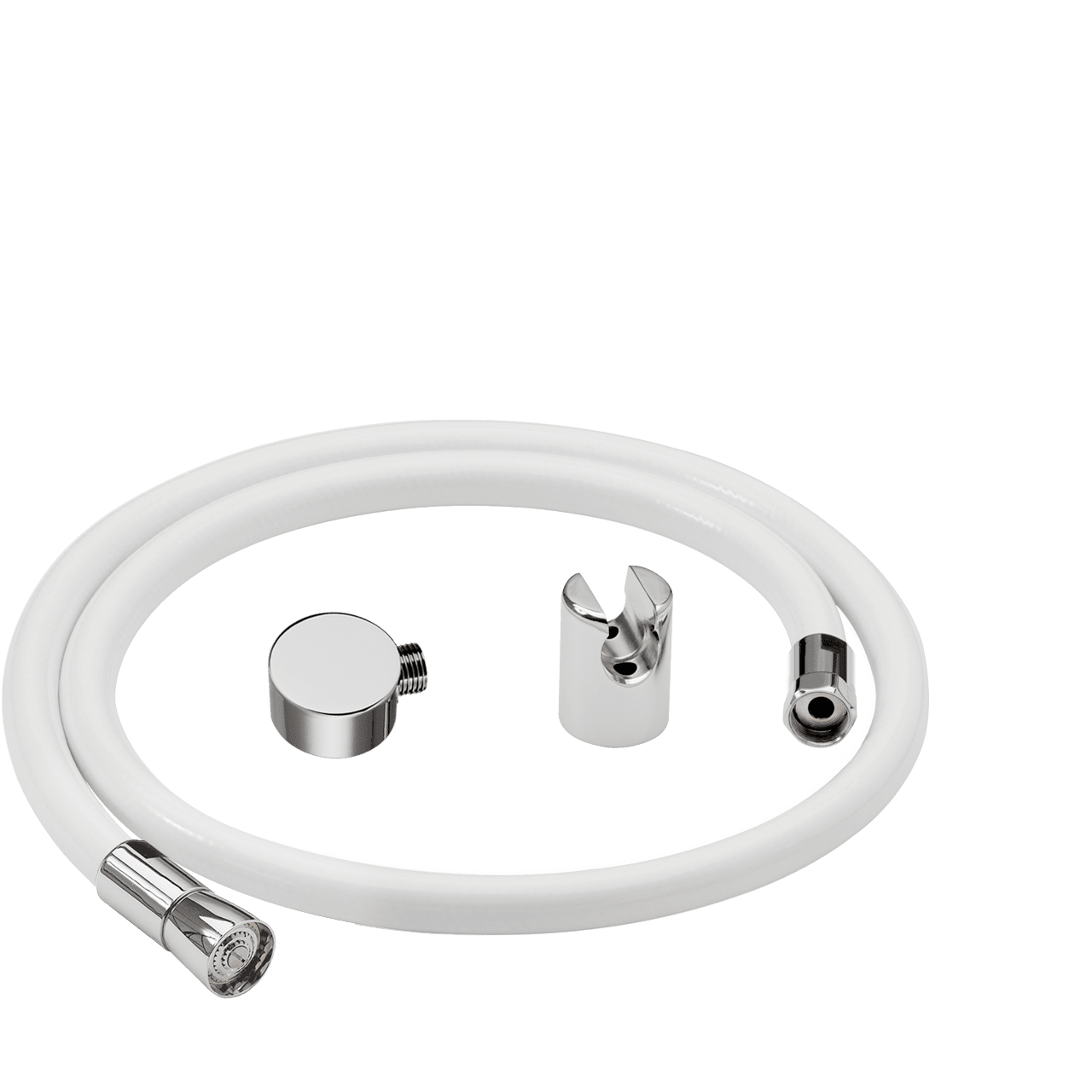 Schlauch in weiß mit Verschraubungen aus Messing verchromt mit Wandhalter, Wandanschlusswinkel und Siebstrahldüse gerade als Gießbrause