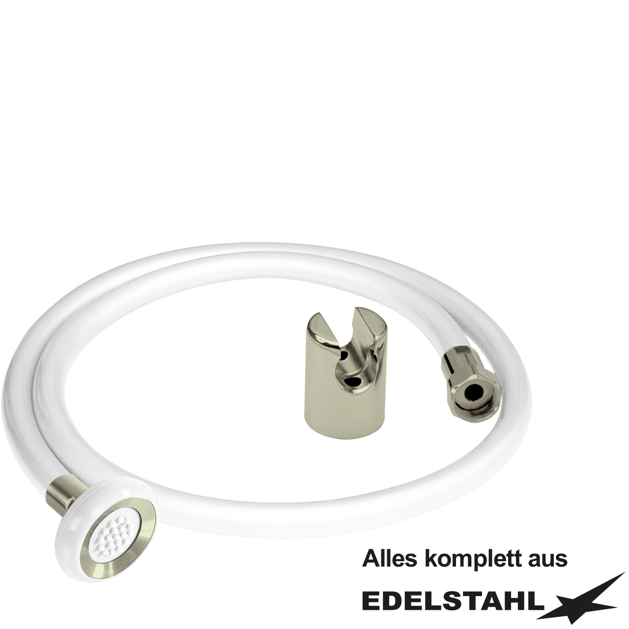 Schlauch in weiß mit Verschraubungen aus Edelstahl mit Wandhalter und vollgummiummantelter Siebstrahldüse