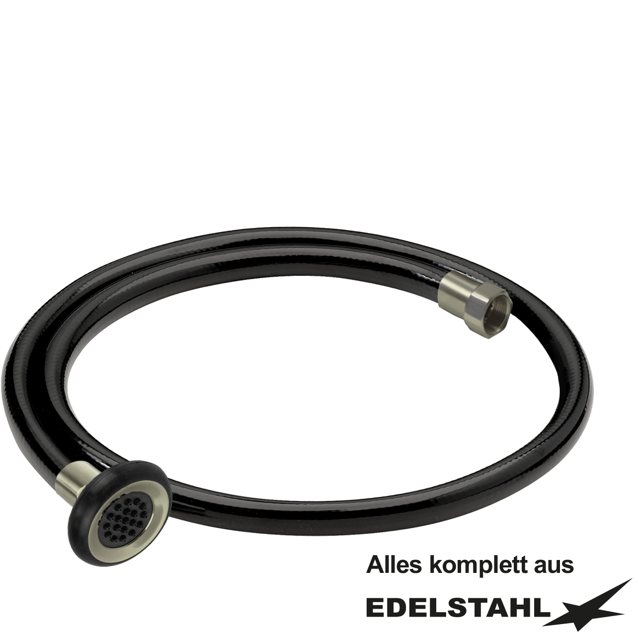 Schlauch in schwarz mit Verschraubungen aus Edelstahl und vollgummiummantelter Siebstrahldüse