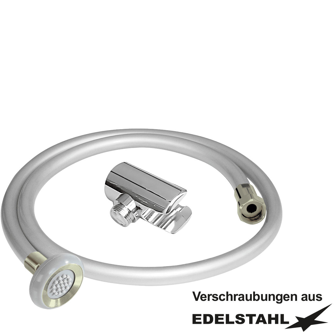 Schlauch in silbergrau mit Verschraubungen aus Edelstahl mit Wandhalter, Kombi-Eckventil und vollgummiummantelter Siebstrahldüse