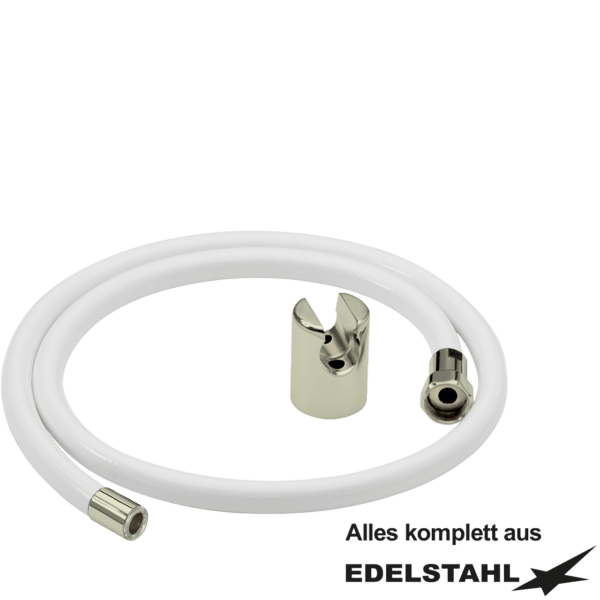 Schlauch in weiß mit Verschraubungen aus Edelstahl mit Wandhalter und Vollstrahlhülse