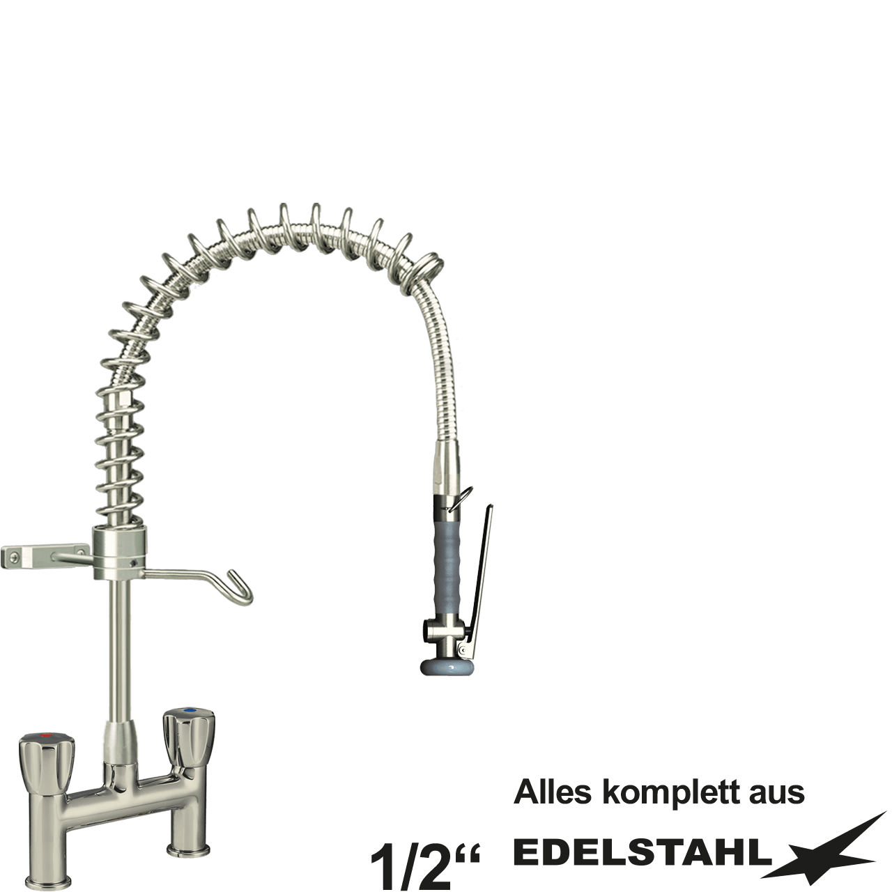 Vorspülbrausen Zweigriffmischer-Zweiloch-Standbatterie 1/2″ ohne Auslaufventil am Rohr mit RV komplett aus Edelstahl