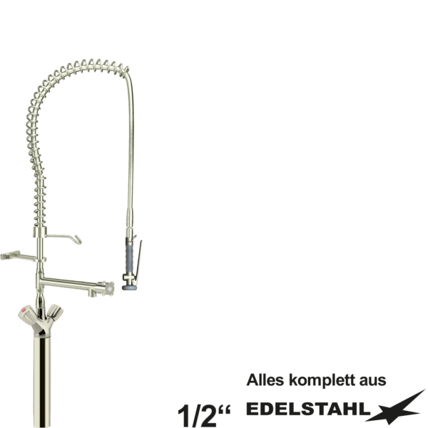 Vorspülbrausen Zweigriffmischer-Einlochbatterie 1/2″ mit Auslaufventil am Rohr mit RV komplett aus Edelstahl