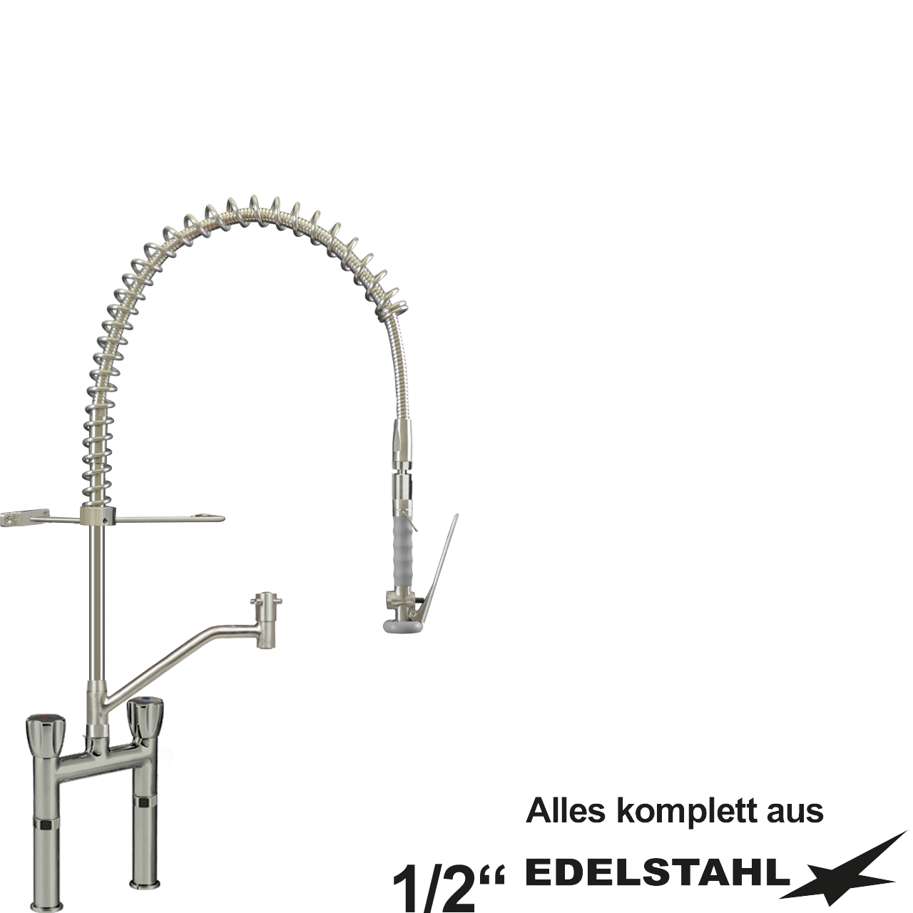 Vorspülbrausen Zweigriffmischer-Standbatterie 1/2″ mit Auslaufventil am Rohr mit RV komplett aus Edelstahl